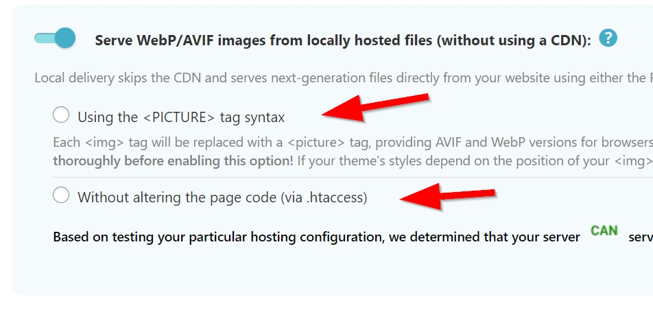 - Enable one of ShortPixel’s local WebP/AVIF delivery options. For that, go to your ShortPixel dashboard and then to Settings > ShortPixel > WebP/AVIF & CDN. Enable the “Serve WebP/AVIF images from locally hosted files (without using a CDN)” option and then choose one of the two sub-options.
