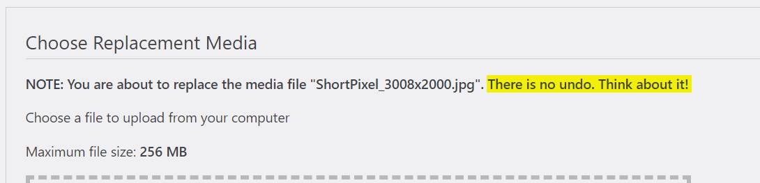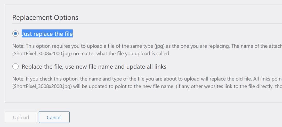 - You try to replace your file with a new PNG (remember, on WordPress we have a JPG converted from a PNG) with the option “Just replace the file”.