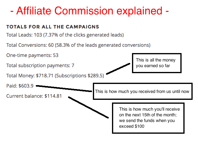 As an affiliate, you can view your Affiliate Stats in the administration area. At the beginning of each month we check the stats and if your Current balance exceeds $100, we ask you to send us an invoice and we will transfer the amount via PayPal. Usually we request the invoice the first week of the month and make the payment on the 15th of the month.