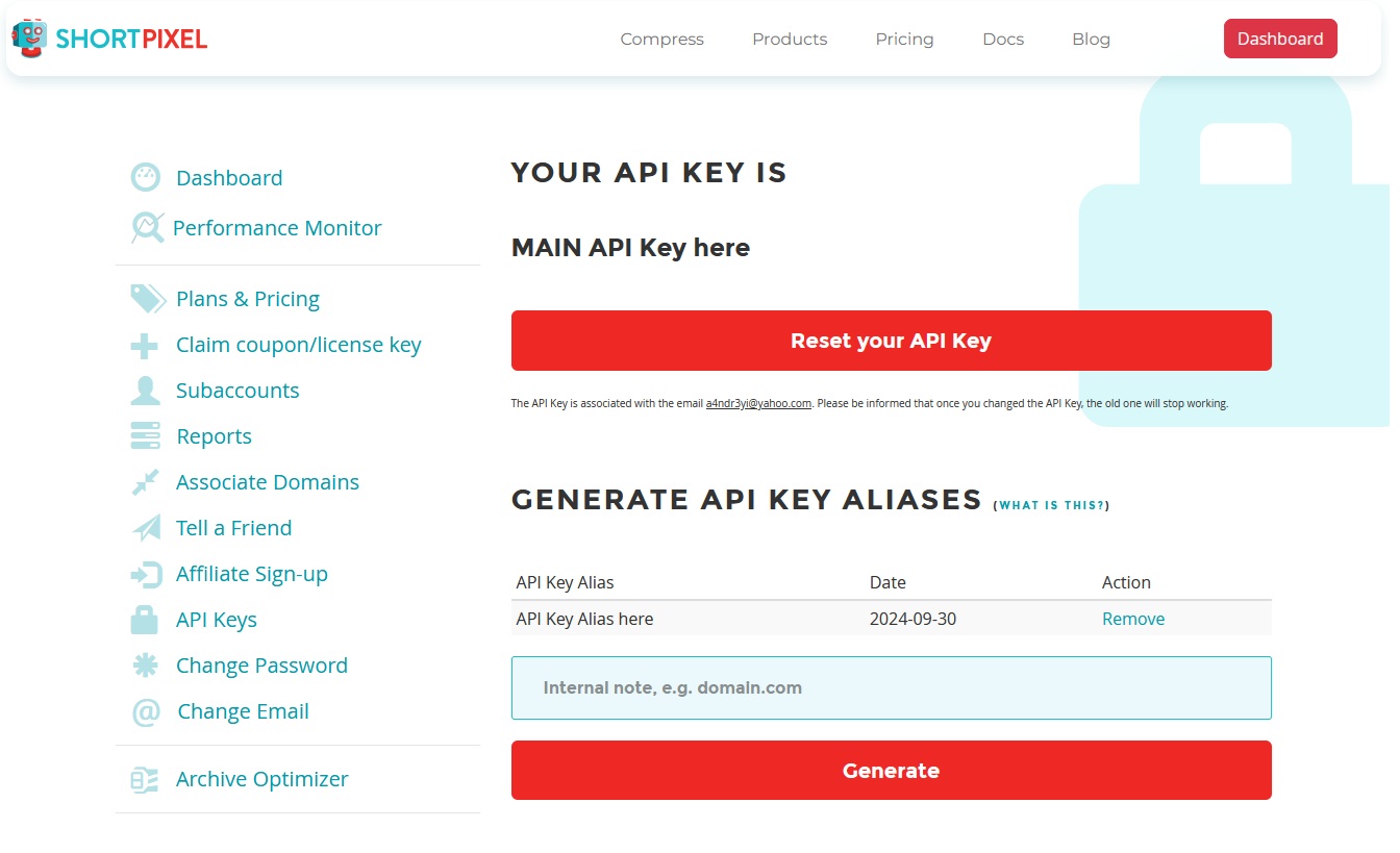 With the API Key Aliases option, found on the API Keys page of your ShortPixel dashboard, you can quickly create and manage temporary or permanent API keys for use on multiple websites.