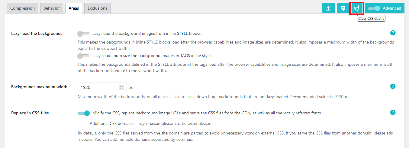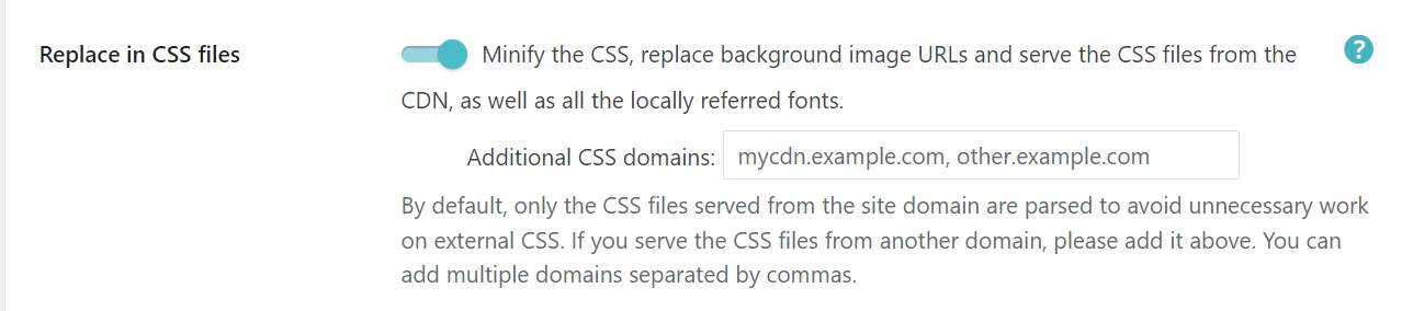 This option, if enabled, works by default for CSS files on your domain. If you have CSS files from other domains, you can add them on the text box, separated by commas.