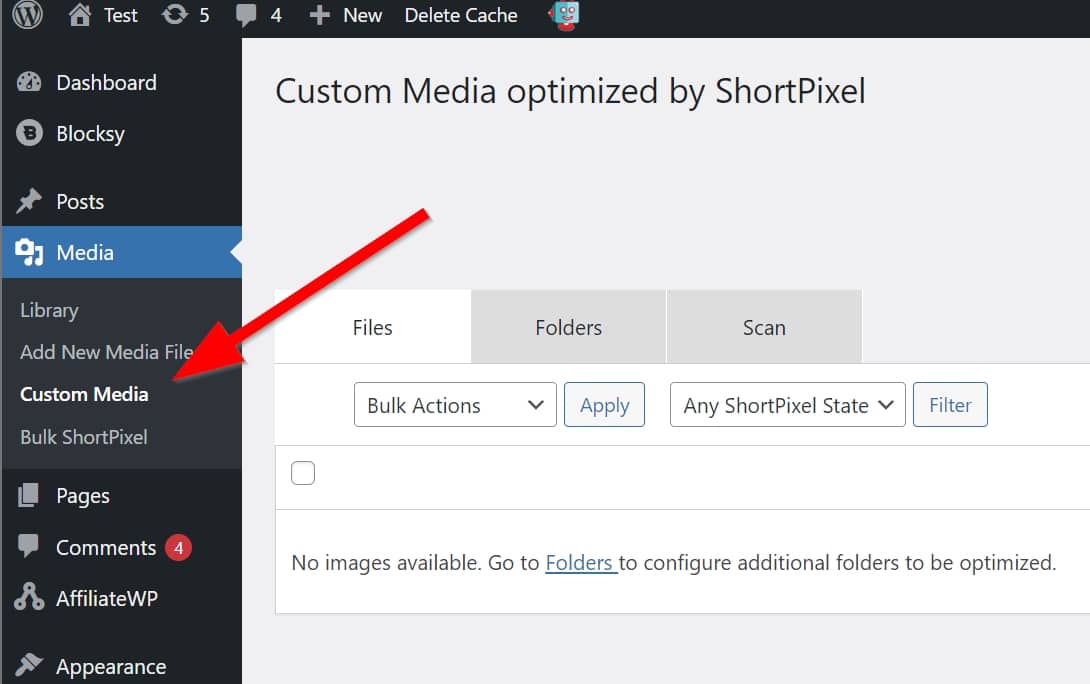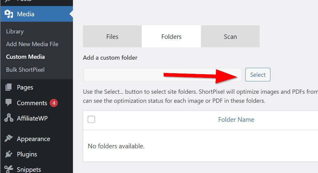 There, go to the Folders tab, click on the “Select” button and select the folder where the images you’d like to optimize are located (you should probably consult with your theme/plugin developer what’s the exact path). Once you add the folder(s), you can bulk optimize the images via Media > Bulk ShortPixel, or manually on the Files tab inside the Custom Media section.