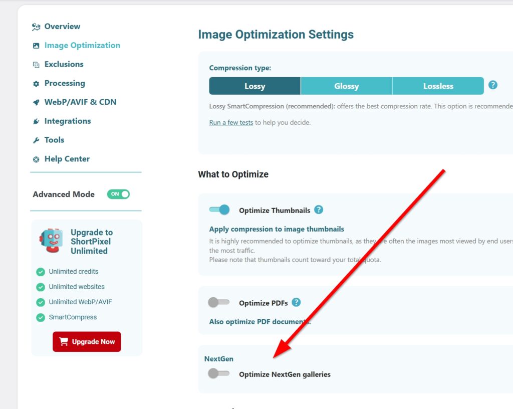 To allow the plugin to optimize the NextGEN Gallery images, you need to enable the “Optimize NextGen galleries” option in our plugin settings (Settings > ShortPixel > Image Optimization). This option will add all your current NextGEN galleries to the Custom media folders list, and will also optimize all the future galleries and images.