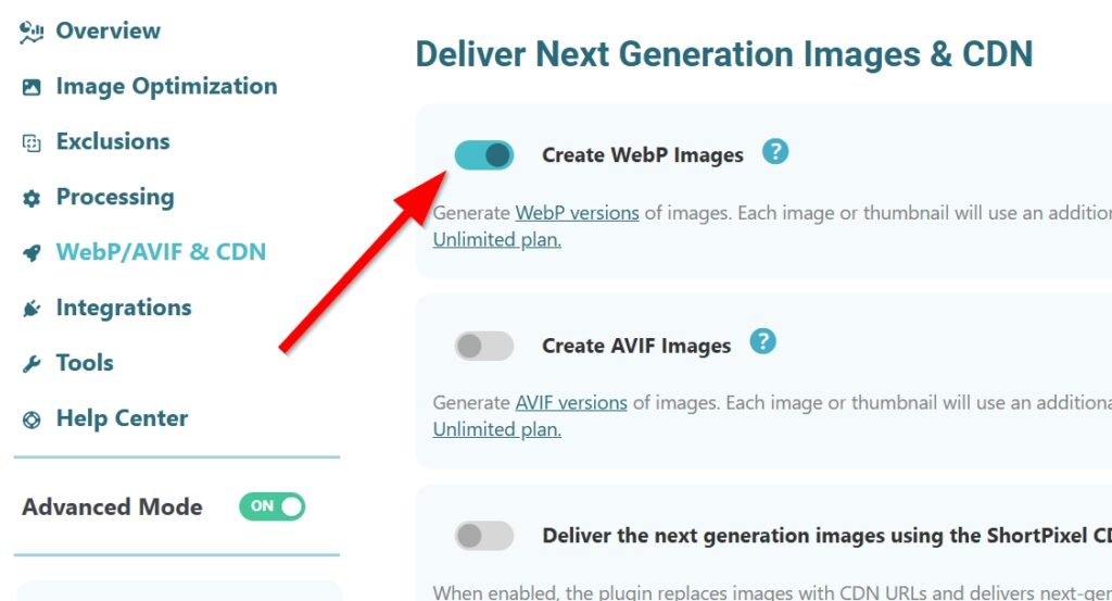Just enable the “Create WebP Images” option in the “WebP/AVIF & CDN” section of the ShortPixel settings in your WordPress dashboard.