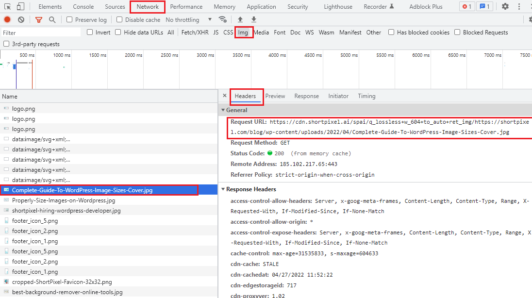 To check if this is the case, inspect your website by right-clicking anywhere on the page and selecting Inspect (or pressing ⌘ Cmd + ⌥ Option + C on macOS or CTRL + SHIFT + C on Windows). Then, navigate to Network > Img, select a sample image from the list, and click to view the Headers.