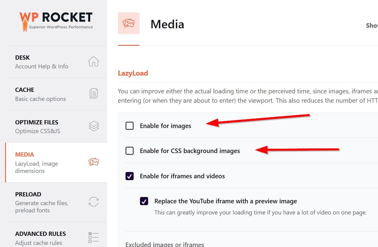 - You must deactivate lazy loading for all images. Go to Settings > WP Rocket > Media > LazyLoad and disable “Enable for images” and “Enable for CSS background images”.