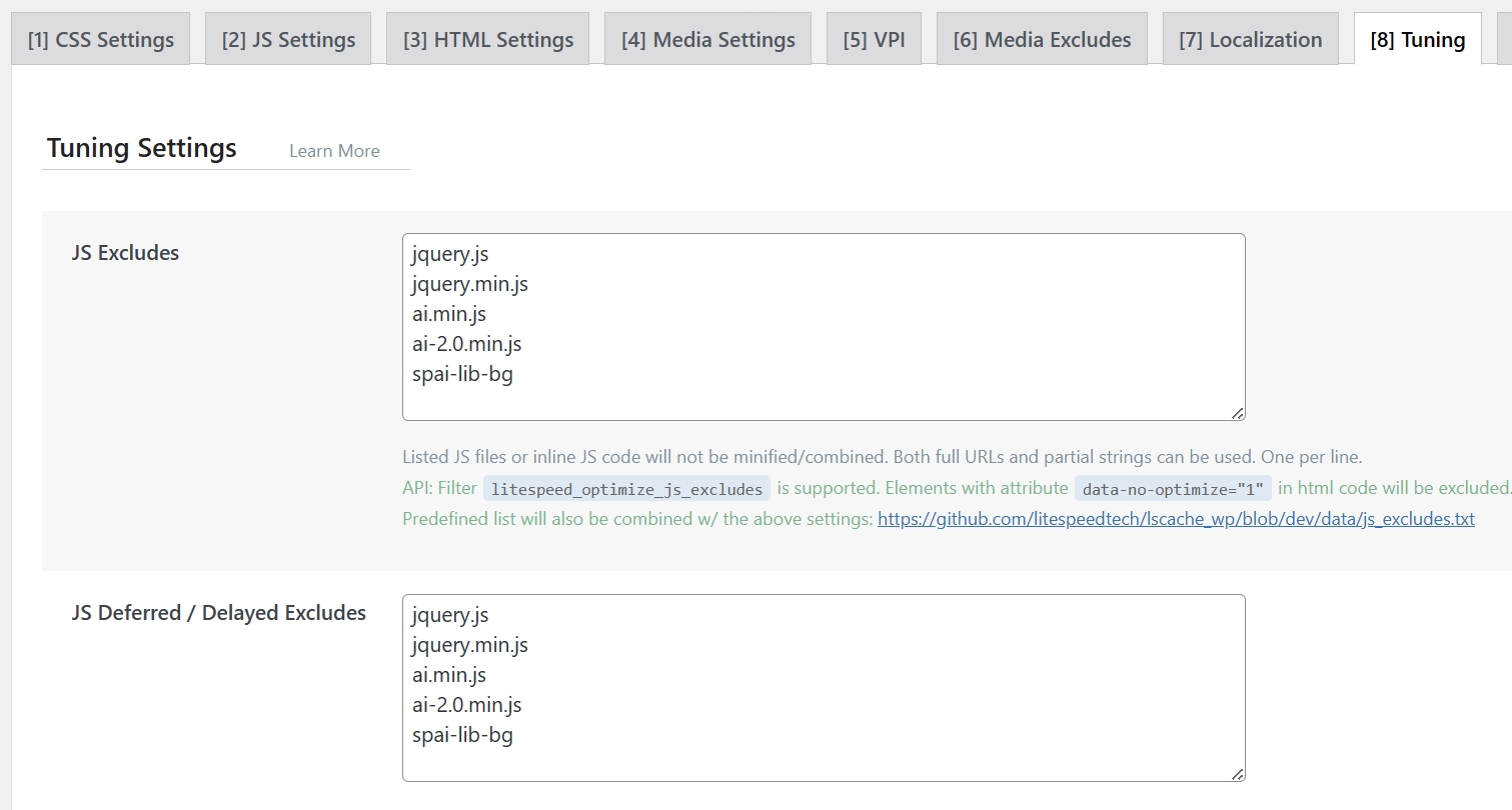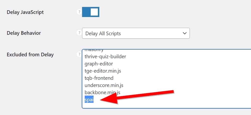 - If you are using the option “Delay JavaScript execution”, you will need to add the following lines in the “Excluded JavaScript Files” field:
