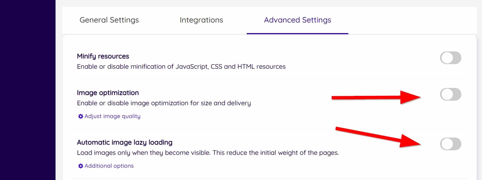Then, login to your NitroPack dashboard on nitropack.io. In the Advanced Settings section, you must disable "Image optimization" and "Automatic image lazy loading".