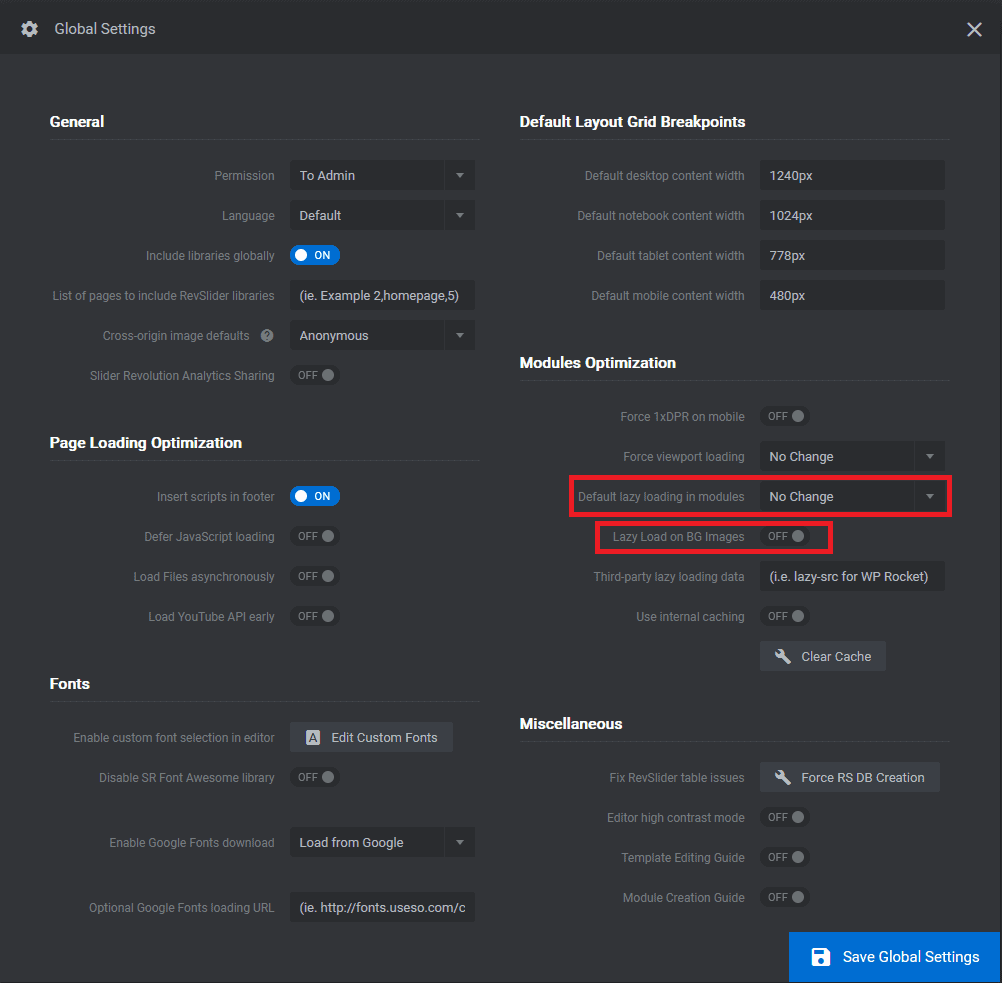 Navigate to your WordPress admin dashboard > Slider Revolution > Globals, and under "Modules Optimization", set the "Default lazy loading in modules" to No change, and disable the "Lazy load on BG images".