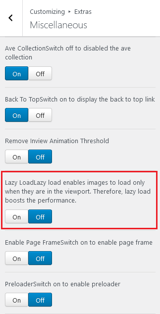 Disable image lazy loading by navigating to your WordPress dashboard > Appearance > Themes > Customize button under Ave theme > Extras > Miscellaneous > Image lazy loading feature, as seen below.
