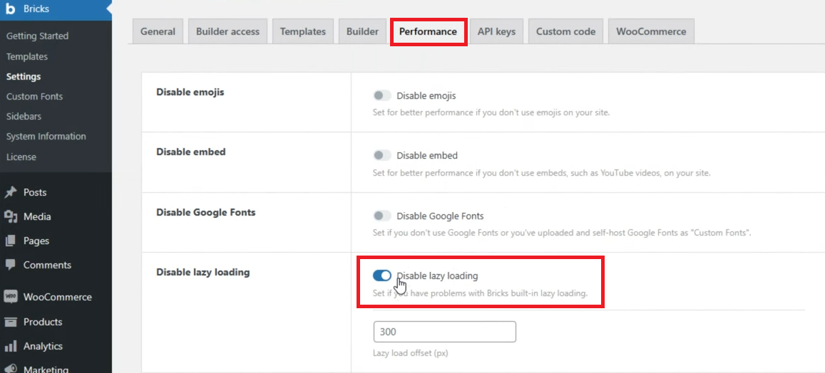 - Enable the Disable the lazy-loading setting via Bricks > Settings > Performance.
