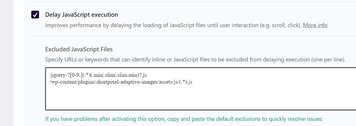 - If you are using the option “Delay JavaScript execution”, you will need to add the following lines in the “Excluded JavaScript Files” field: