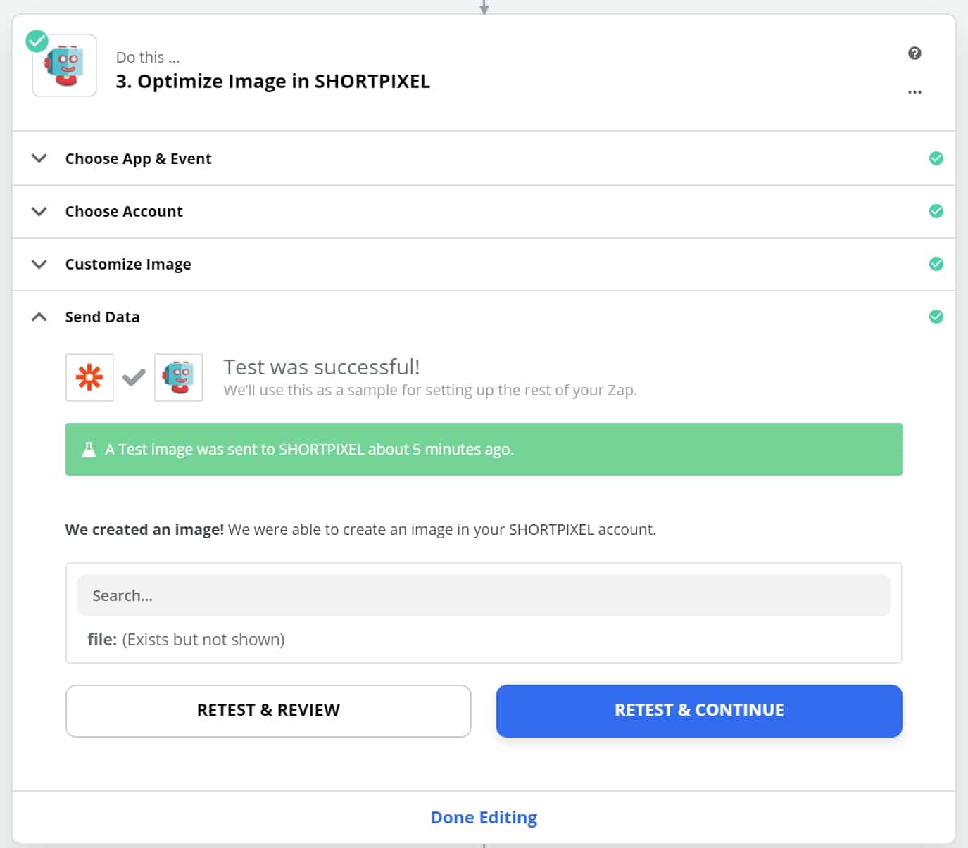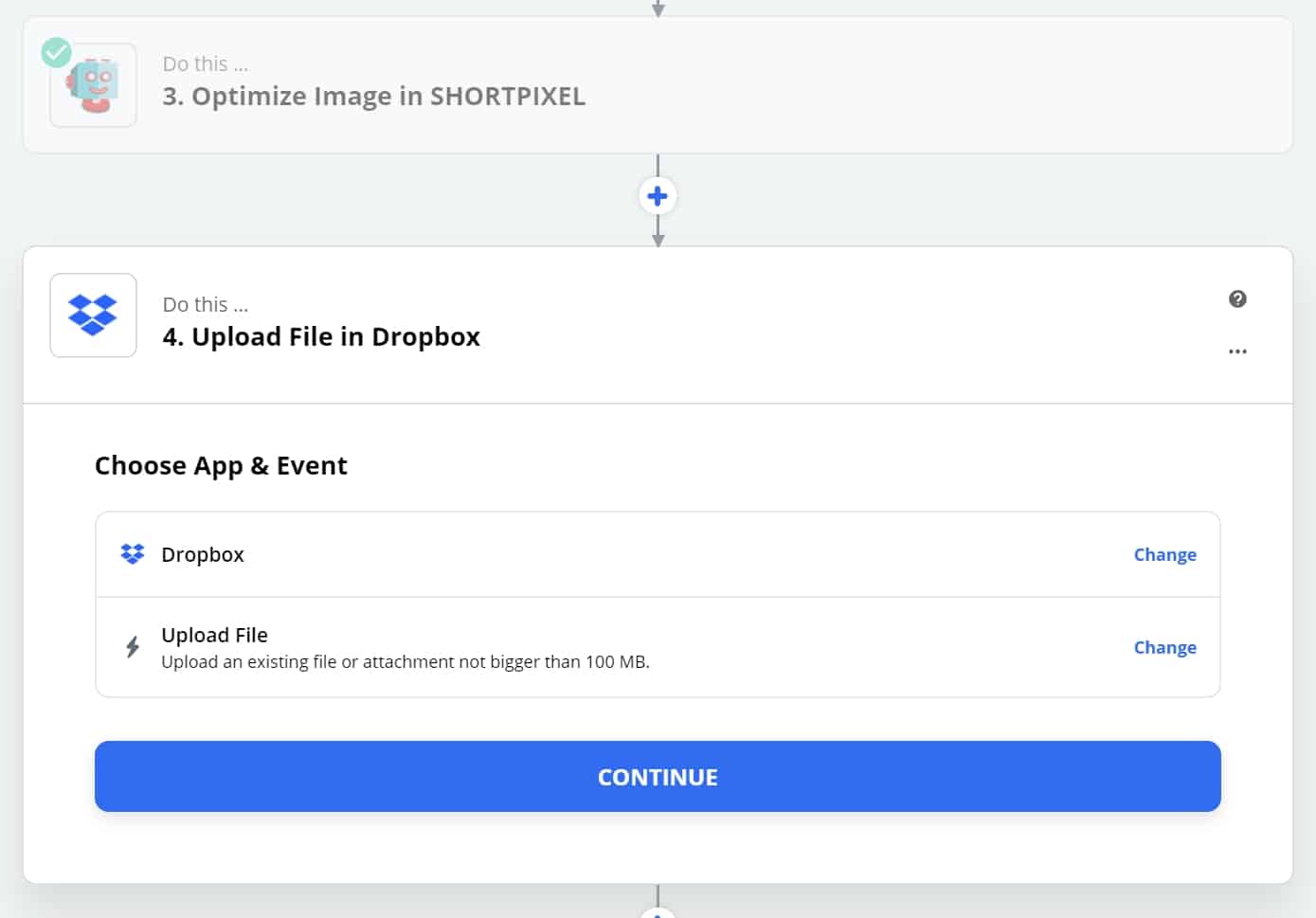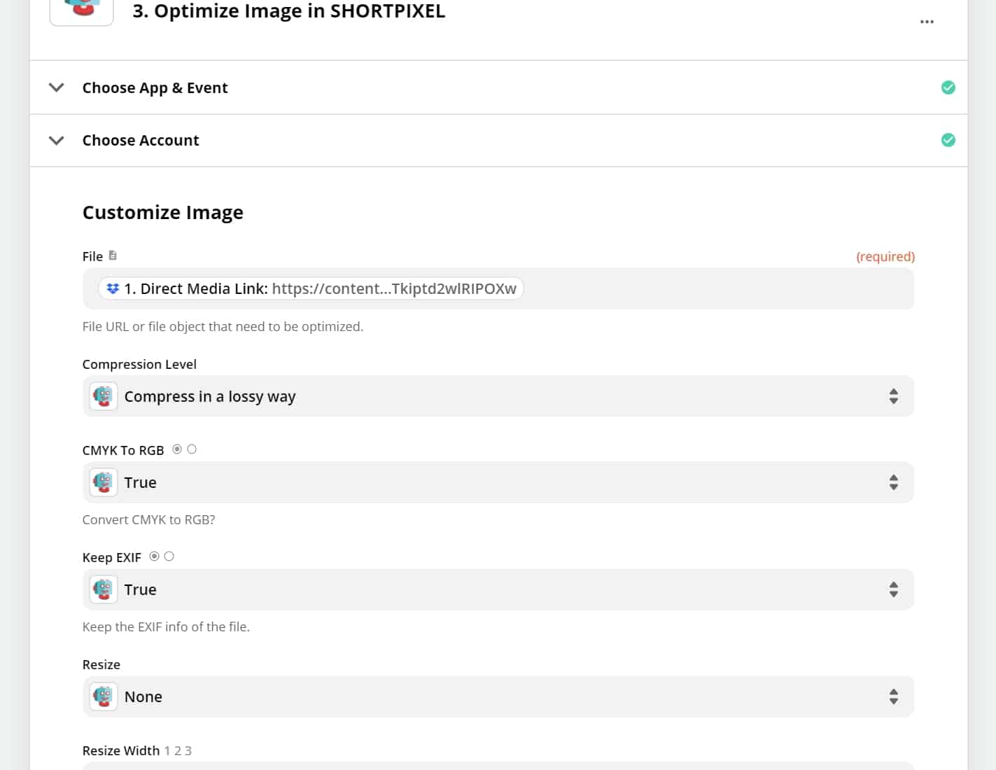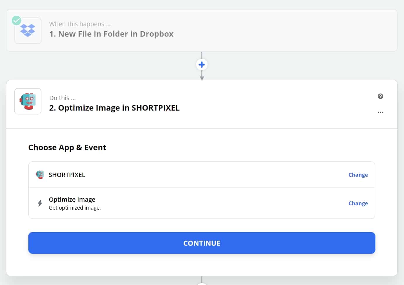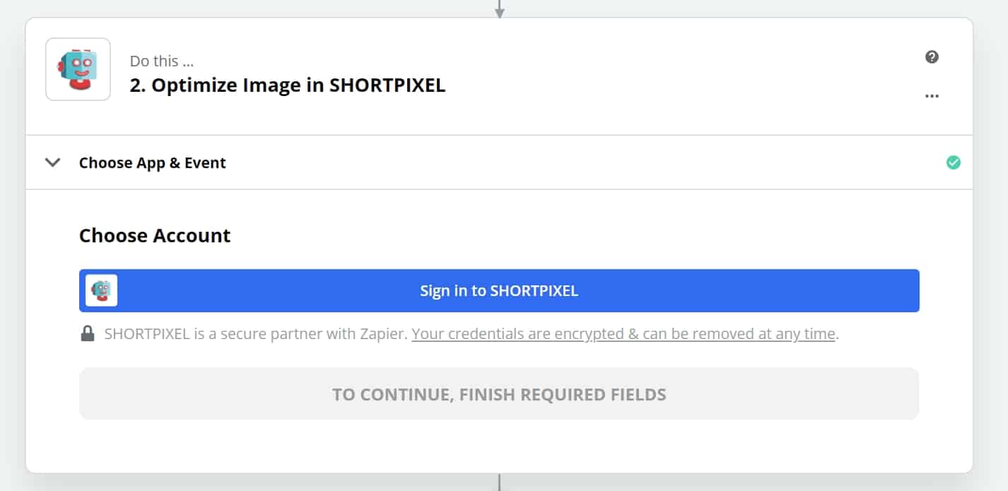 Proceed to the next step. Make sure you see the ShortPixel app and Event as in the following image and continue: