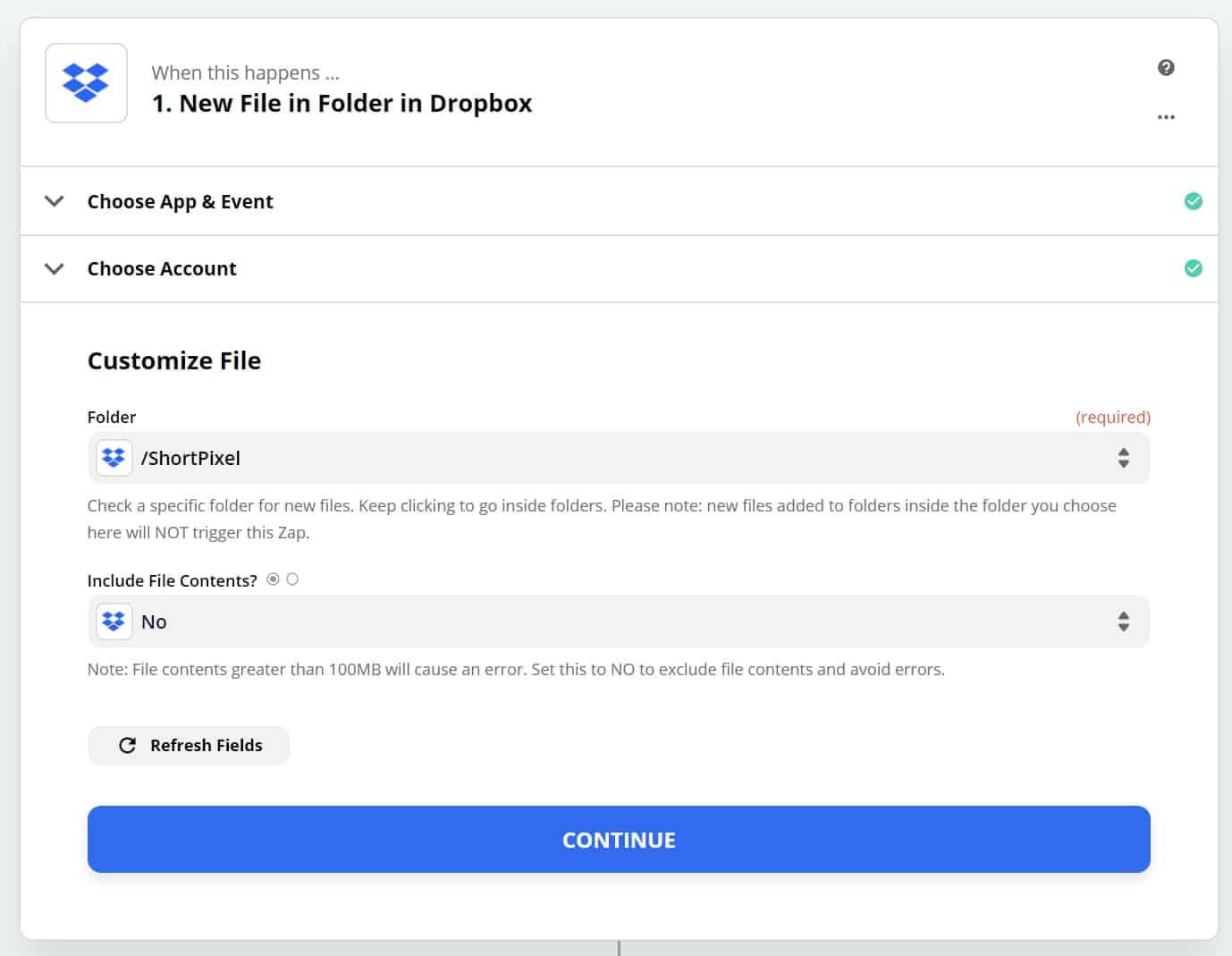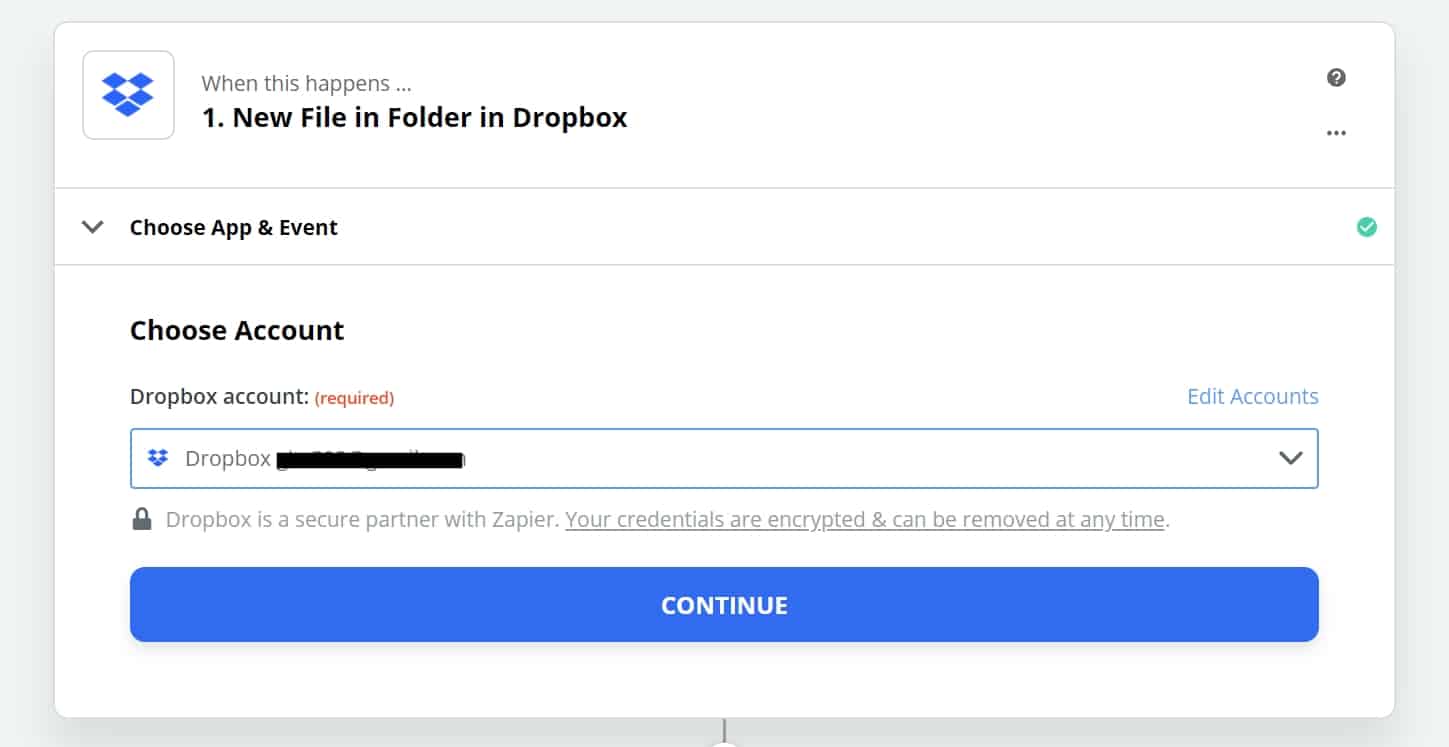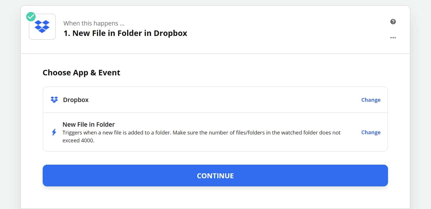 Select the Dropbox App and choose the “New File in Folder” Event: