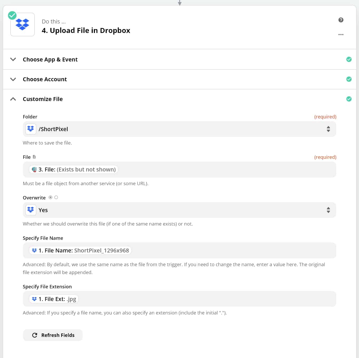 It’s time to upload the file back to Dropbox. To do this, add a final step to your Zap. Select the Dropbox appand the “Upload File” Event: