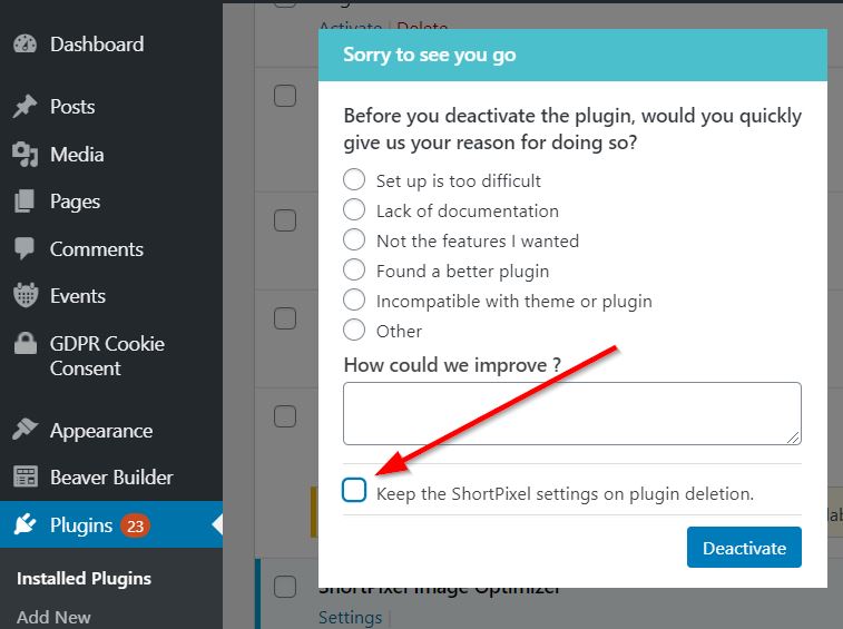 /wp-content/uploads/ShortpixelBackups/. - Deactivate and uninstall the ShortPixel Image Optimizer plugin. Make sure that you uncheck the option “Keep the ShortPixel settings on plugin deletion“.