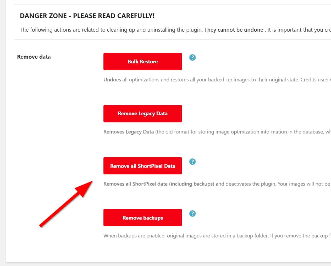 /wp-content/uploads/ShortpixelBackups/. - Go to Settings > ShortPixel > Tools, click on “Remove all ShortPixel Data” and follow the instructions.