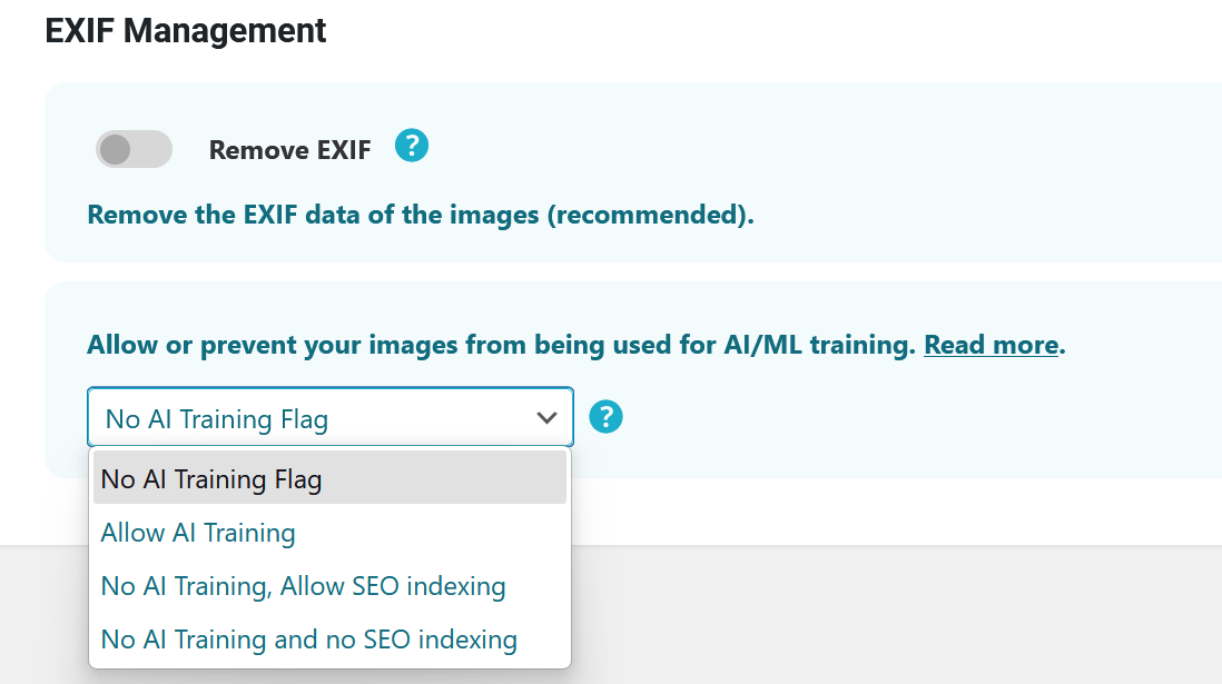 This setting adds specific metadata to your images that signals they can or cannot be used for Artifical Intelligence (AI) and Machine Learning (ML) training.