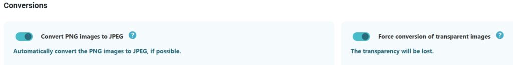 - You can always force the conversion for transparent images by enabling the option called “Force conversion of transparent images”. Please note that this option only becomes available if the first one is enabled.