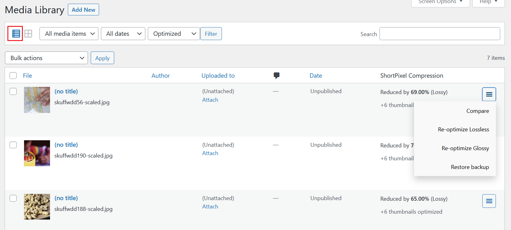 In order to restore or reoptimize a single image, you simply need to navigate to Media > Library, switch to List View, and under the ShortPixel Compression column, you will find a hamburger menu with several options, as seen below: