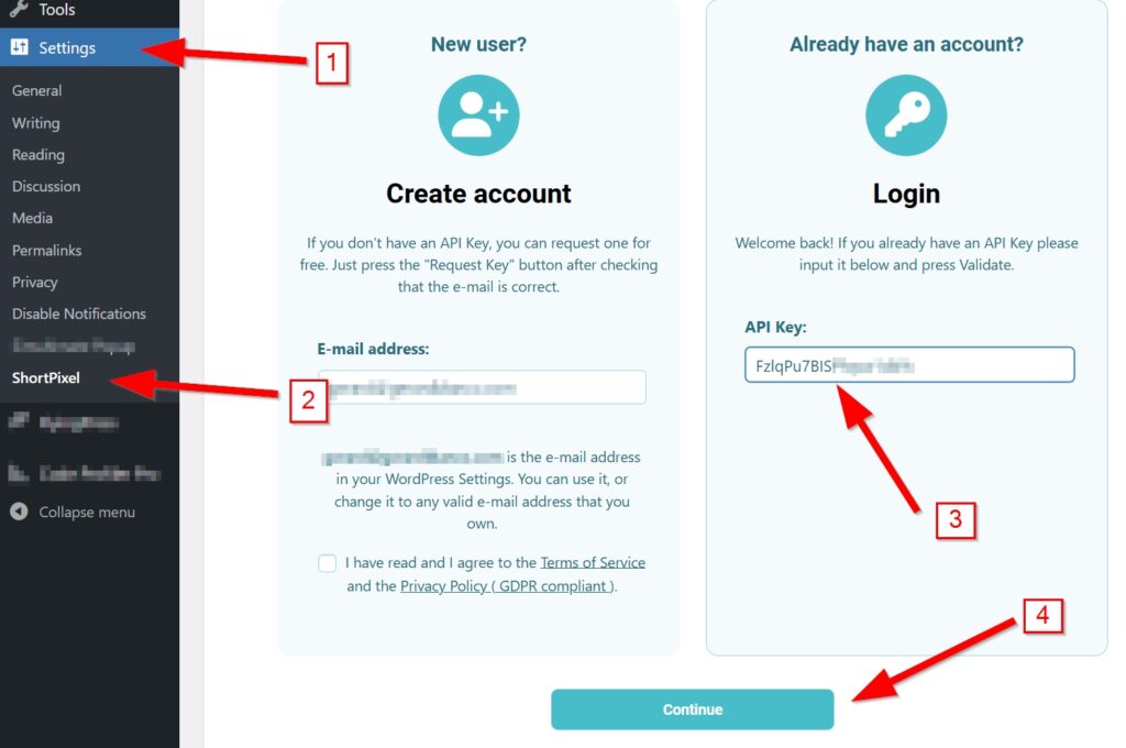 - Go to the plugin settings (Settings > ShortPixel) and paste the API Key you copied.