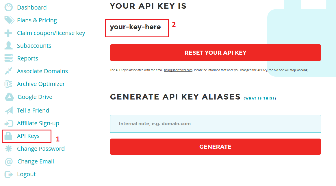 - Log in to your ShortPixel account, go to the API Key menu and copy your API Key.