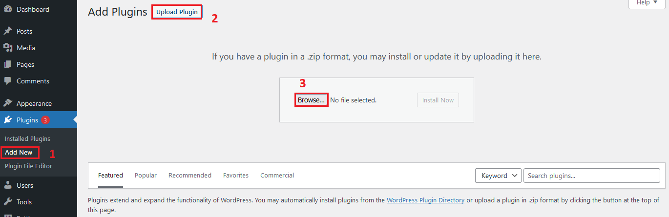 - Go to your WordPress admin area and go to Plugins > Add New > Upload Plugin.