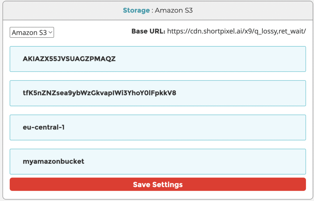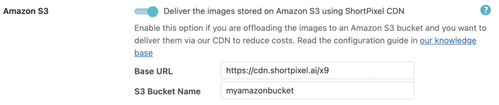 - Enable the Amazon S3 option within ShortPixel Adaptive Images, then add the Base URL provided by our dashboard in the previous step, along with your full Amazon S3 bucket URL from your Amazon S3 bucket details.