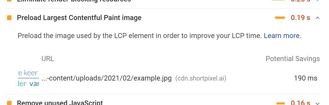Unfortunately, none of the ShortPixel plugins can help preload the LCP element. However, if you’re using ShortPixel Adaptive Images, as shown in the example above, you can try going to Settings > ShortPixel AI > Exclusions and adding the image to the “Don’t lazy load” box. This won’t necessarily remove the warning in PageSpeed Insights, but it will almost certainly improve the LCP time.