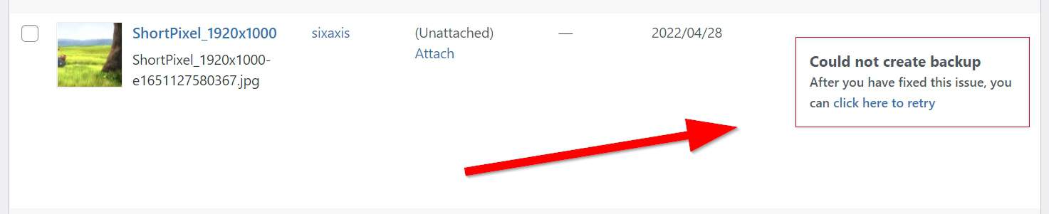 If you optimize a single image from the Media Library (you need to be in List view to do this), the error message will appear in the same Media Library. Example:
